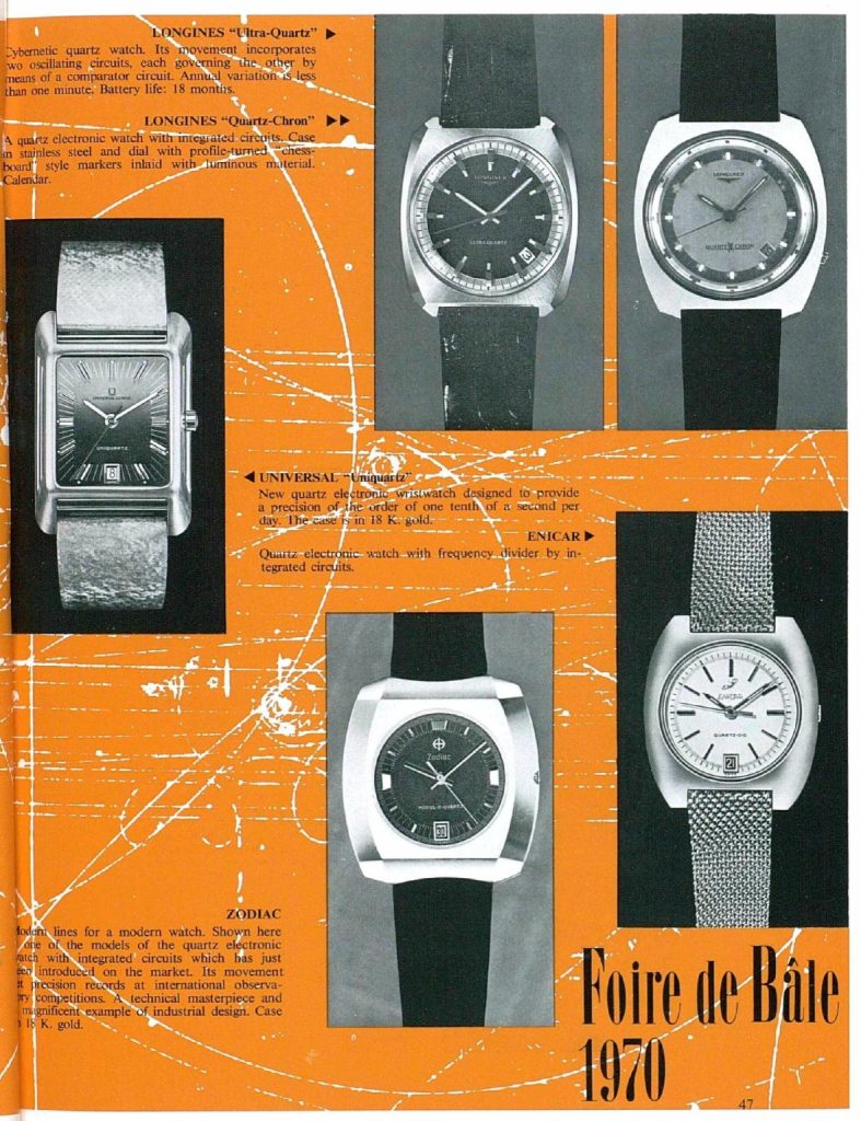 Bulova ‘Accuquartz’, Enicar ‘Quartz-O-D’, IWC ‘International’, Longines ‘Quartz-Chron’, Patek Philippe ‘Cercle d’Or’, Piaget ‘Ref.: 14101’, Rado ‘Quartz 8192’, Rolex ‘Ref.: 5100, Texano‘ and Omega ‘Electroquartz’