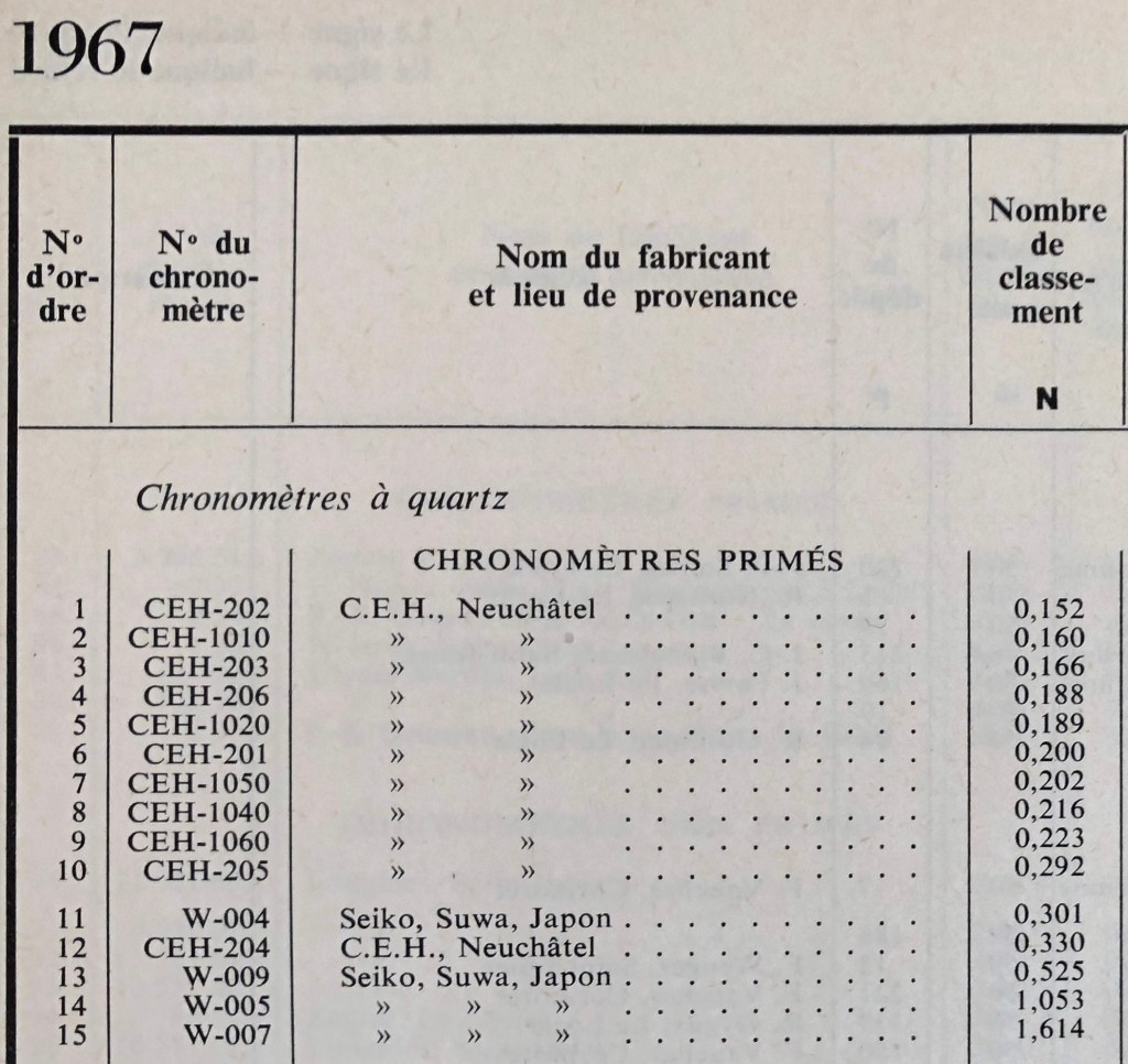 All along the last months of 1967, most of the 20 hand made Beta 1 prototypes (numbered CEH-1xx, why these have been renumbered CEH-1xx0 on paper during the observatory competition is unknown) and Beta 2 prototypes (numbered CEH-2xx) were brought to the Neuchâtel Observatory by Jean Hermann for precision testing (1).