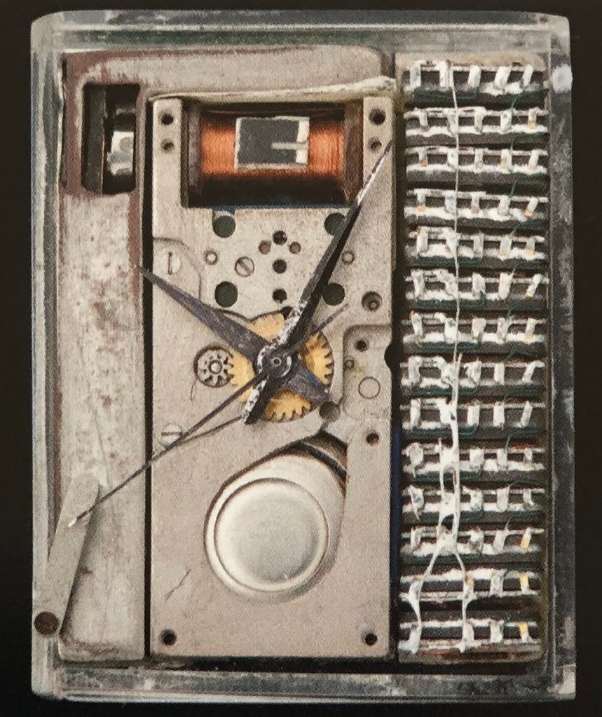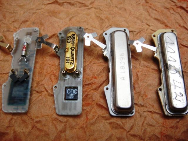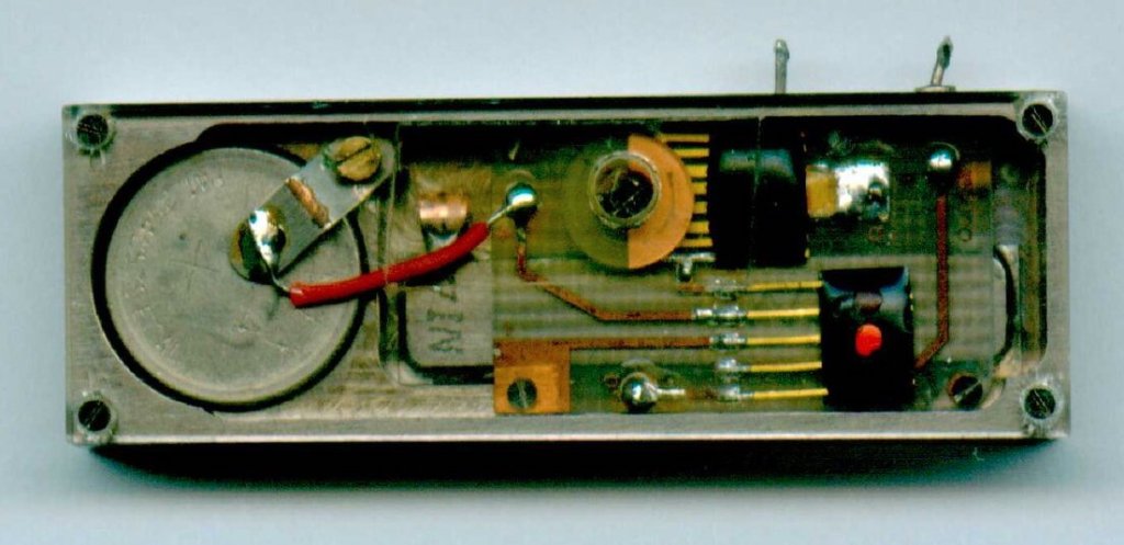 By the first quarter of 1966, Frei disposed already of a miniaturised quartz oscillator prototype with an 8192 Hz quartz resonator (see picture above), a novel fully integrated driver circuit running at less than four microamps current consumption (black epoxy covered IC with red dot) and a frequency adjustment set-up (upper black epoxy covered IC without a dot), all these components survived until and including the industrial phase with minor improvements only (1). The ‘new’ Beta project would advance fast and after few intermediary experimental prototypes the project would be split into two separate entities in November 1966: Beta 1 and Beta 2 (1).