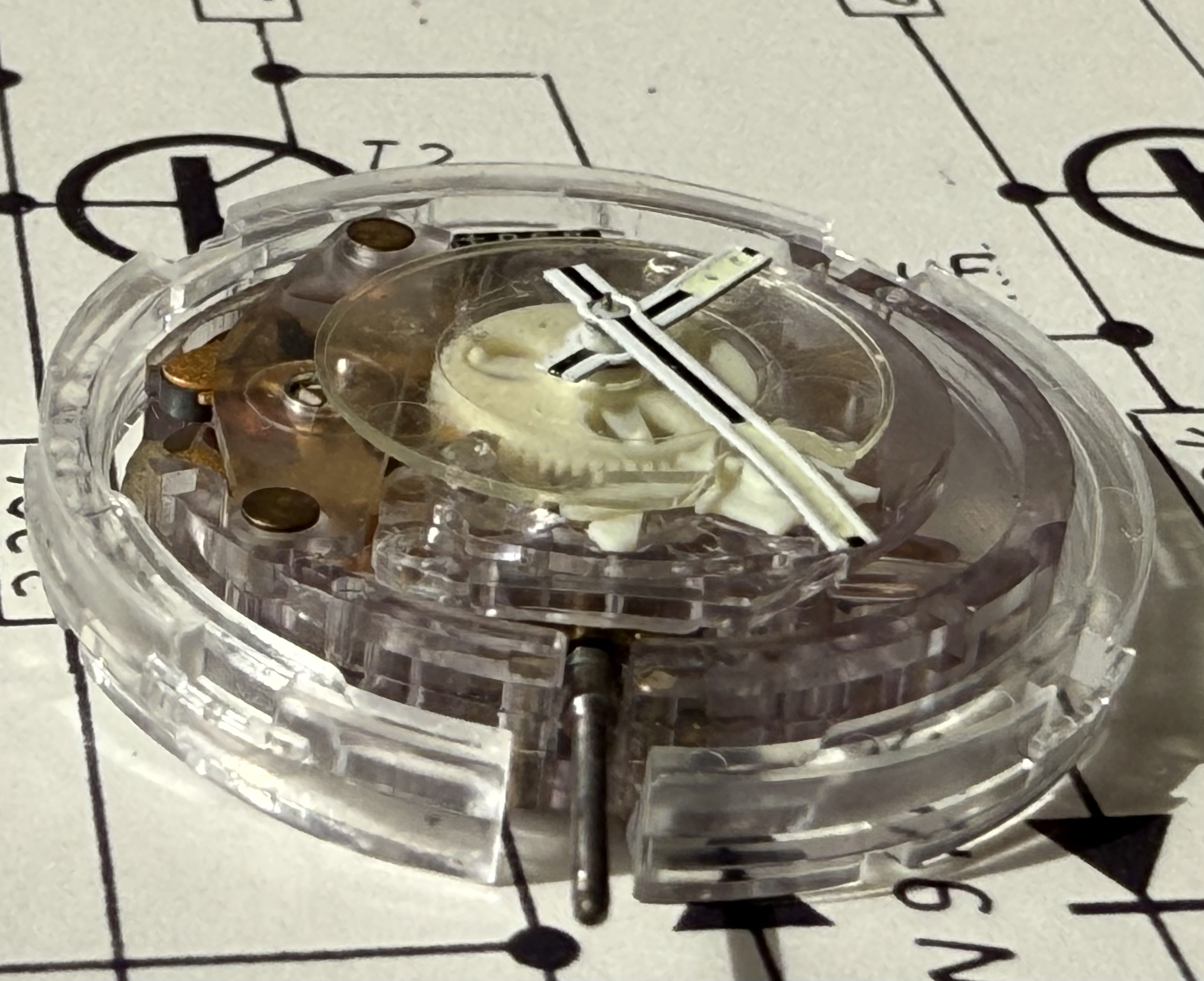 The resulting caliber can be considered the earliest known all plastic, battery driven wrist watch movement, built 13 years before the inception of Swatch. One of only two known such movements is presented below.
