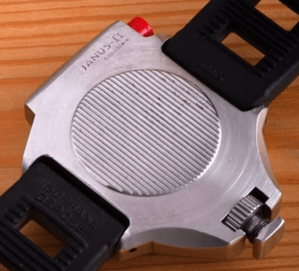The used titanium for the cases is of T2 type, which is as corrosion resistant as platinum. This feature explains also, why such titanium cased versions were tested during the Janus II project in deep ocean saltwater. Moreover, @_tsolo_t has compared the measurements of the titanium version to the steel prototypes and has found that the titanium versions are slightly bigger in size and that they show a distinct ‘lip’ underneath the bezel. Confirming the fact, that these titanium versions were developed as very early versions, the indexing of the bezel is provided by spring loaded studs (see explanation below) (7).