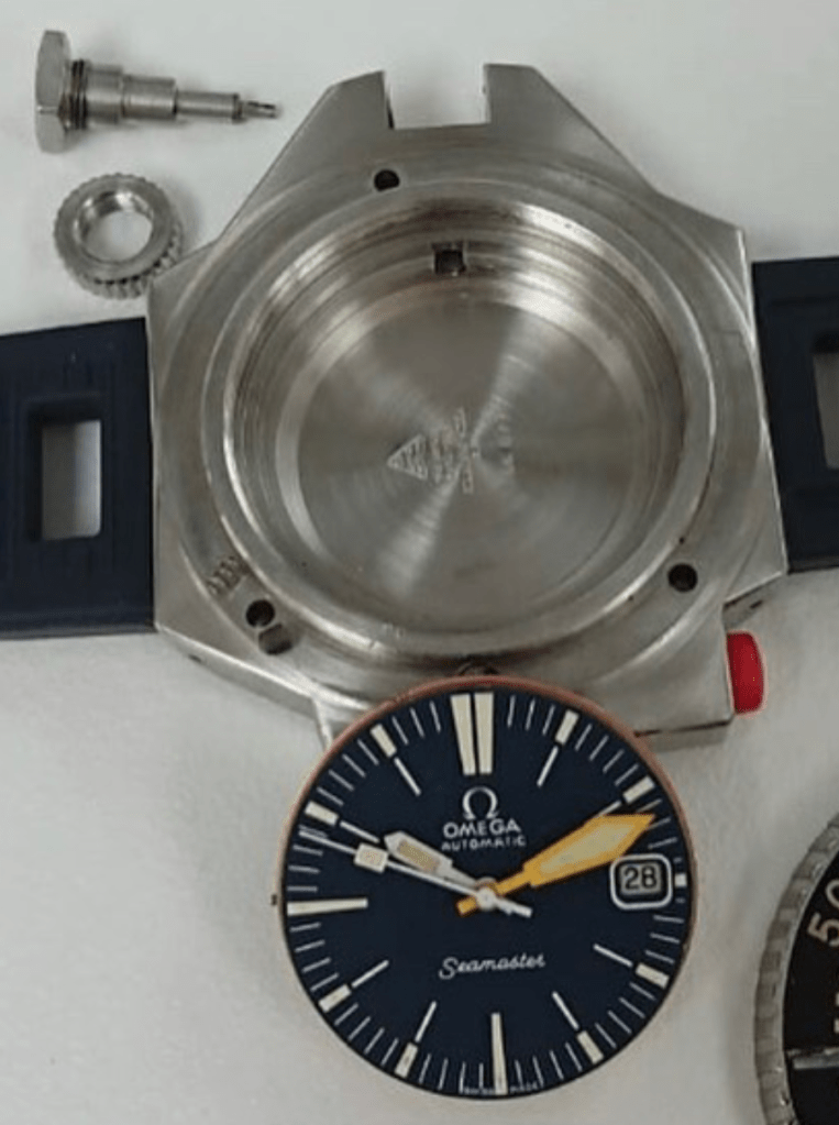 It was assumed for a long time, that Seamaster 600 in latter, inverted’ configuration would have been wrongly assembled, using an alternative date disc. As the dial can be mounted also in 180° position, the case ends up upside-down. Most Seamaster 600 in this ‘inverted’ configuration are indeed mounted the wrong way around, as it is difficult to source correct date discs. However, Marco Richon’s research has shown, that these inverted cases were part of the development. Richon’s research is confirmed by Michel Geiger, a former ‘prototypist’ in Omega’s R & D department working on diving watches. Geiger remembered well, that the very first series of this model, for which he had fashioned the cases in brass, were of the ‘inverted’ type, with a crown at three o’clock and a red push-piece at the bottom left. He no longer remembered, whether there were 300 or 500 pieces made, but confirms that they had been given to to professional divers from Comex (Compagnie d’expertises maritimes) for wear testing (9).