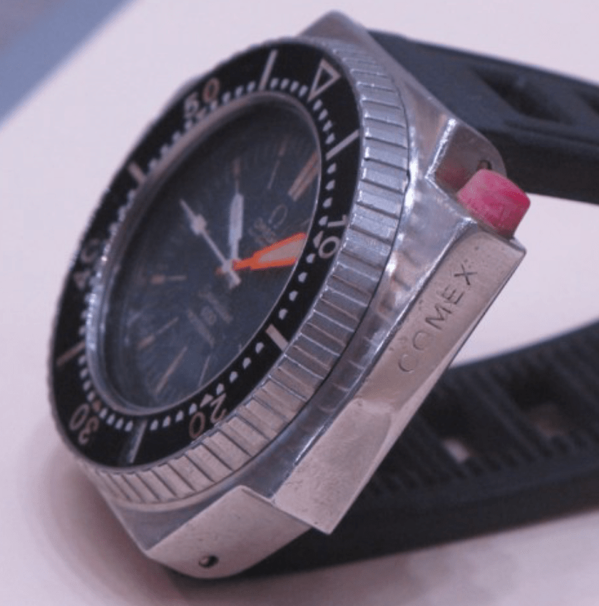 According to production notes from Omega, the type of steel used was dubbed ‘Uranus steel’ by the French manufacturer that supplied the metal. This variety of steel featured the addition of molybdenum to help resist the corrosion caused by acids. Omega settled on this specific alloy after studying the effects of underwater welding in saltwater on stainless steel watches. Today, this specific type of steel is often referred to as ‘904L stainless steel’. The vessels and tools that COMEX (see below) built were often fashioned out of 904 steel (1).