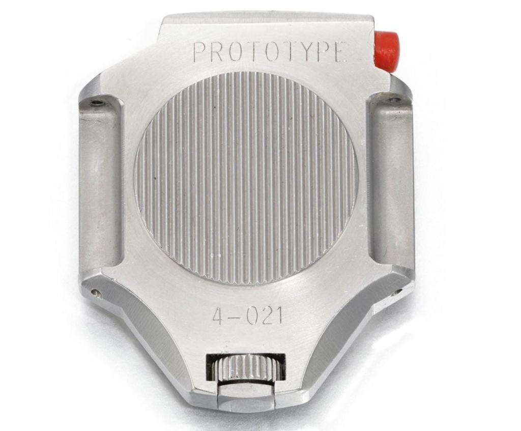 Prototypes feature small differences as compared to the marketed versions. One early feature was a red, acrylic nut against witch the crown was secured. Earlier steel nuts were prone to seizing up with grit. Michel Geiger remembers having to buy toilet brushes with red plastic handles at Migros (a chain of Swiss grocery stores) to obtain the raw material he needed to machine the large push-button on the rotating bezel and the tightening nut on the crown (9).