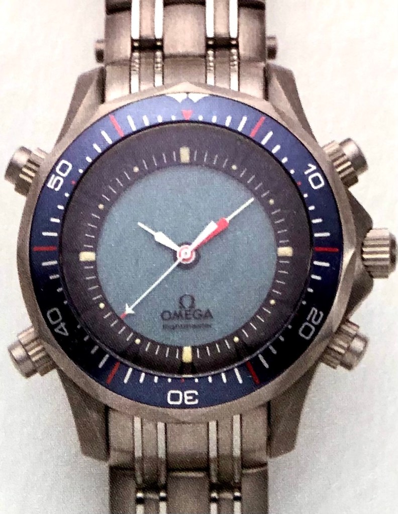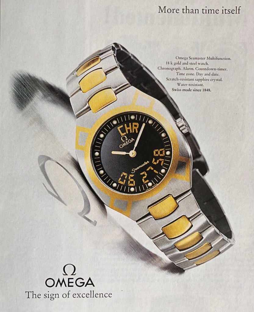 Omega’s Claude André Gygax and Michel Burdet, helped by André Calame and Pierre-André Dubois succeeded to have a running prototype by the end of 1983, but a few months later, due to the fusion of the two Swiss watch giants SSIH and ASUAG (later named Swatch Group) in early 1984, Omega lost the status as a manufacturer of electronic movements and passed the responsibility of the further development of the caliber entirely to ETA. Subsequently, André Triponet, a former engineer at Omega, and Pierre-André Noirjean from FHF took over the project and formed the caliber to suit Tissot’s requirements for their ‘Two Timer’ model (cal.: 958, rectangular dial) and Omega’s Seamaster ‘Multifunction’ (cal.: 1665, circular dial) (1).