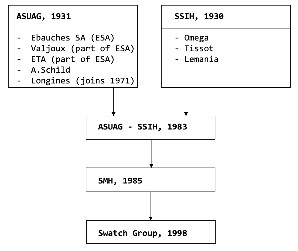 Due to delayed adaptation to the evolving watch market, erroneous decisions concerning production strategies, the still geographically scattered and mostly family owned manufacturers and the fast rising, well organised and centralised Japanese watch industry during the financially turmoiled 1970s and early 1980s, the survival of the entire Swiss watch industry was at stake and to be able to surmount this difficult time, many manufacturers agreed to enter negotiations with the major Swiss banks UBS and SBS (now merged as UBS). One of the facts which illustrates the imminent danger for the Swiss watch industry was the plan of some SBS executives to sell Omega to Asian industrials (2). The final result of these negotiations was the merger of ASUAG and SSIH in 1983, which was streamlined, reorganised and renamed SMH in 1985. The simplified path towards these mergers can be seen below.