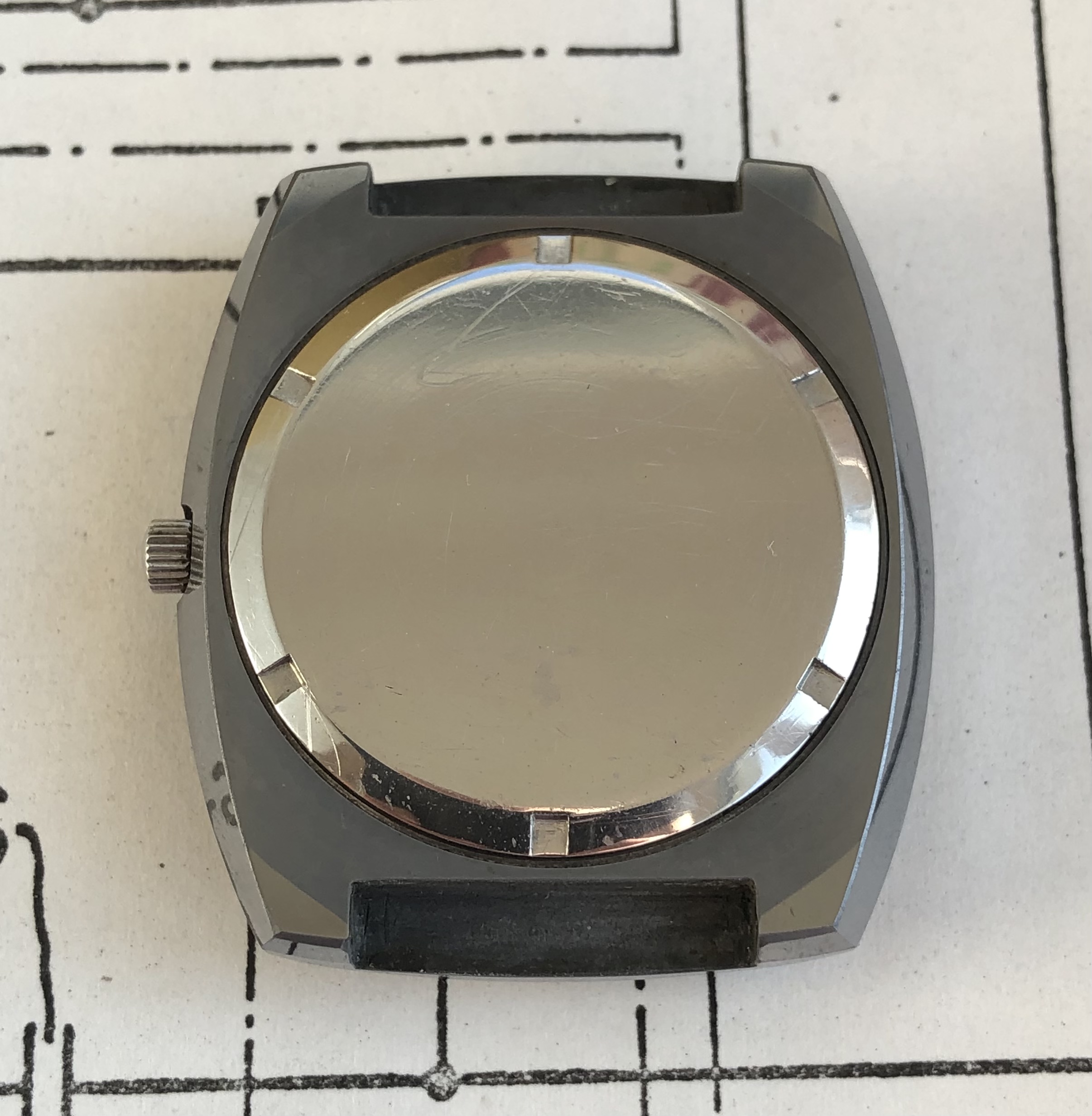 This prototype shows small differences as compared to the marketed version. The case is slightly different, showing a smaller recess for the crown and consequently a smaller crown. The case back is neither marked with the reference number nor with the reference to the ‘Bulova patent’ for the movement, but only with an ink stamp ‘T5’, see last of the pictures of the presented watch. The crystal is bevelled and the hands are of different shape.